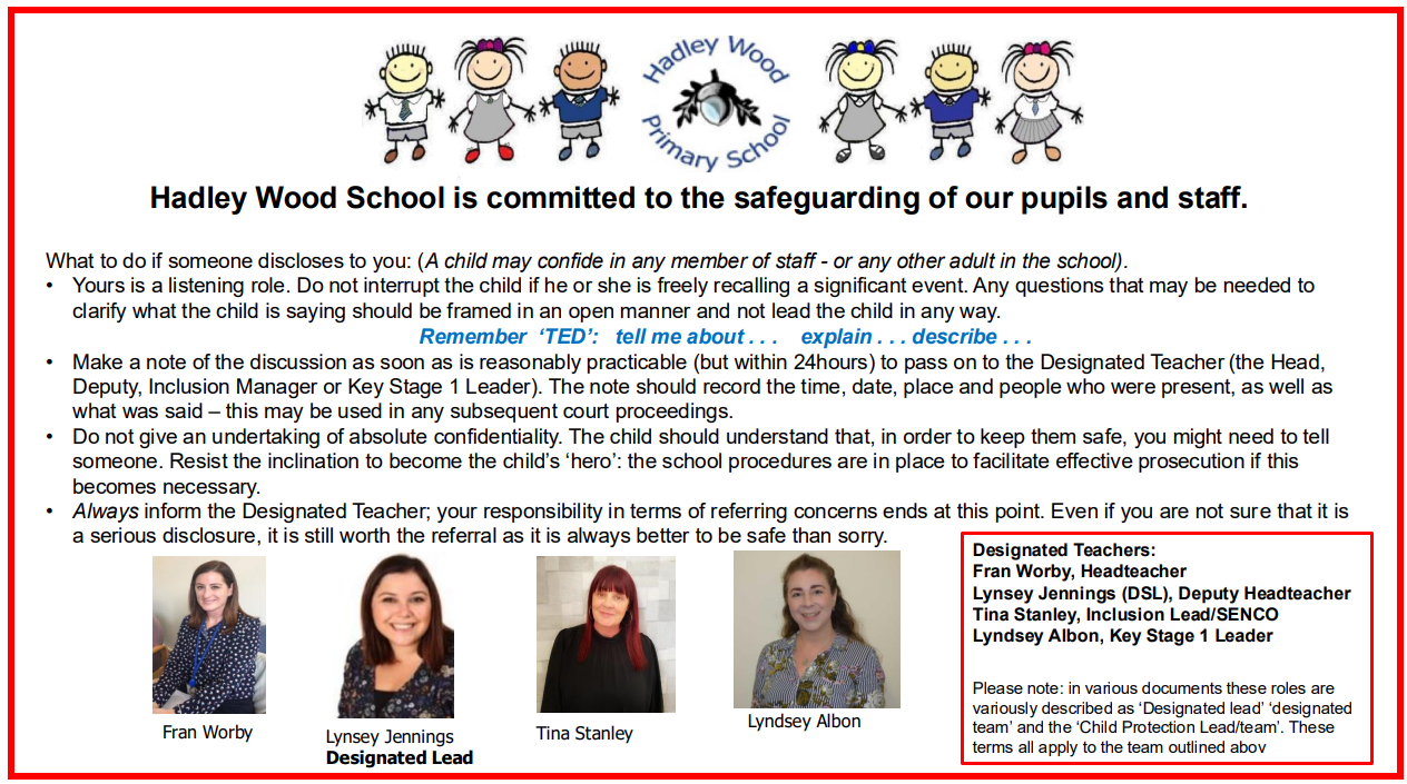 At Hadley Wood Primary School, making sure everyone in our whole school community is safe is a main priority. All staff and volunteers in our school are DBS checked and all staff, by law, have a duty of care to report any concerns they might have regarding a child to a Designated Safeguarding Leader (DSL).